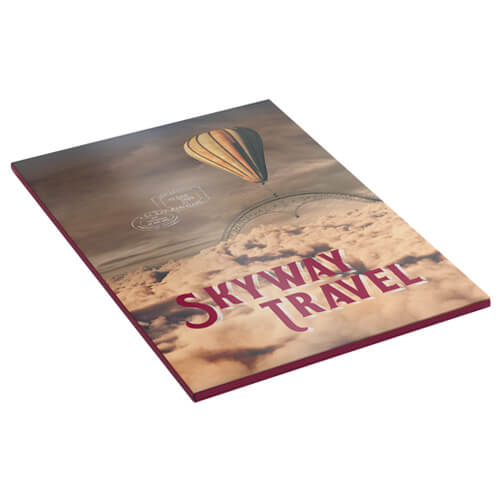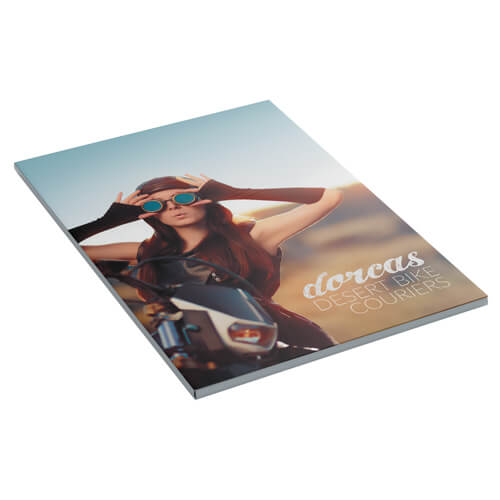Oversize A4, A5 or A6, with full colour on one, or both sides. Soft-touch laminate outside.
